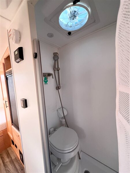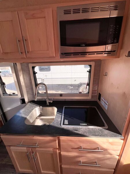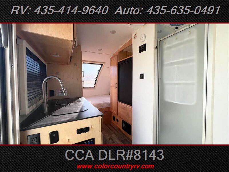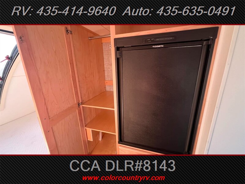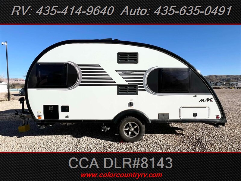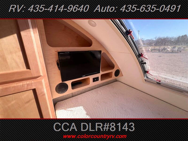 The exterior of the Max sports it's unique teardrop shape, with a wide array of thoughtful touches that help make your adventure a little bit easier. The Max is designed to deliver maximum style on the road and maximum ease-of-use during setup. The interior features custom 100% maple hardwood cabinetry with dovetail joints, a true queen-size bed and master bed entertainment center, dedicated pantry and wardrobe spaces, wetbath, shower, and a marine style toilet. The Max’s interior is designed to deliver maximum comfort and maximum happiness. Additional features: 2" rear receiver for bike accessory rack, aluminum framed roof and sidewalls, block foam insulated roof with one-piece, seamless fiberglass roof, euro-style insulated & dual pane windows, LED accent lighting throughout, microwave, and 8" deep kitchen sink.